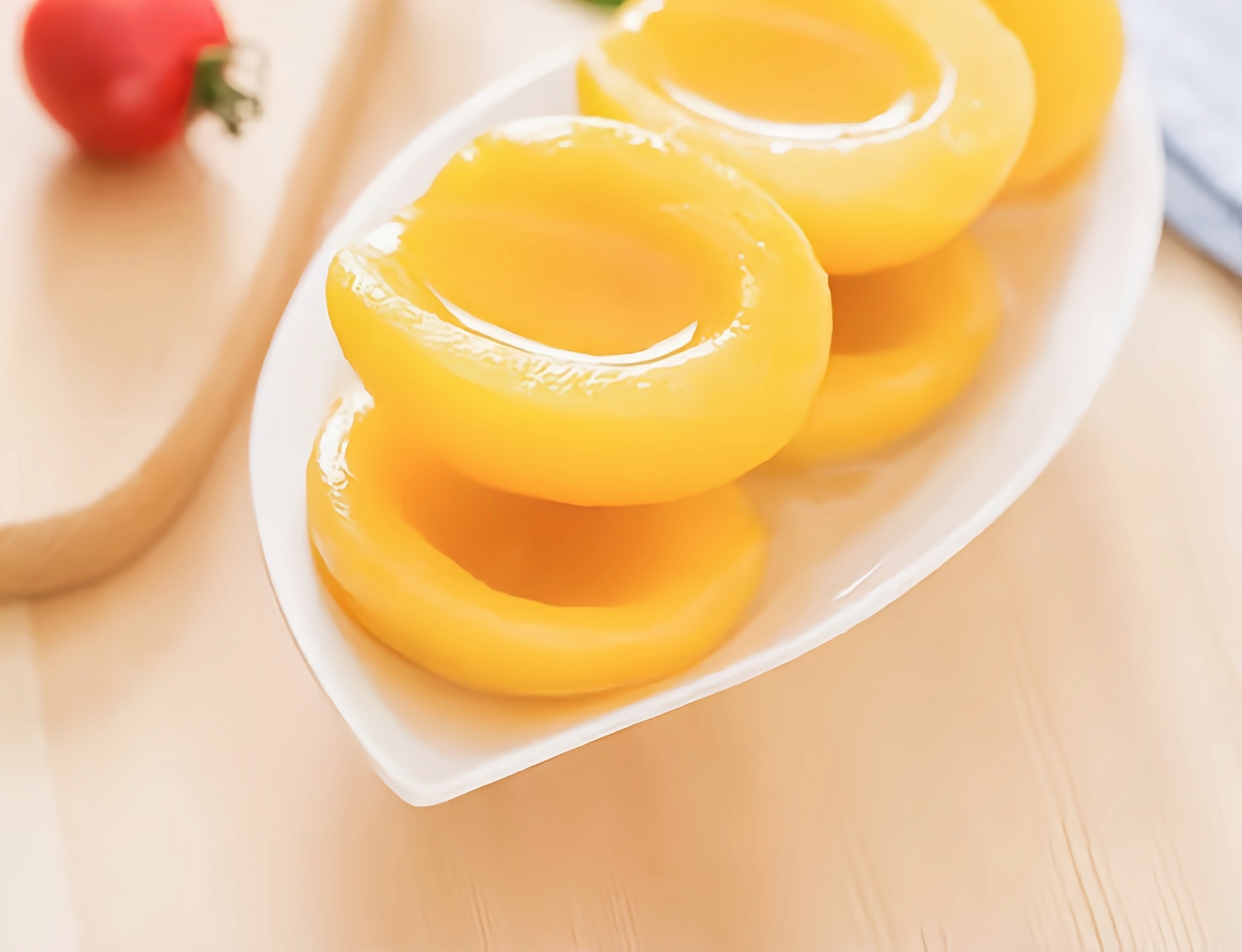 La forma del melocotón amarillo enlatado: rodaja de melocotón amarillo enlatado, trozo de melocotón amarillo enlatado, dados de melocotón amarillo enlatado